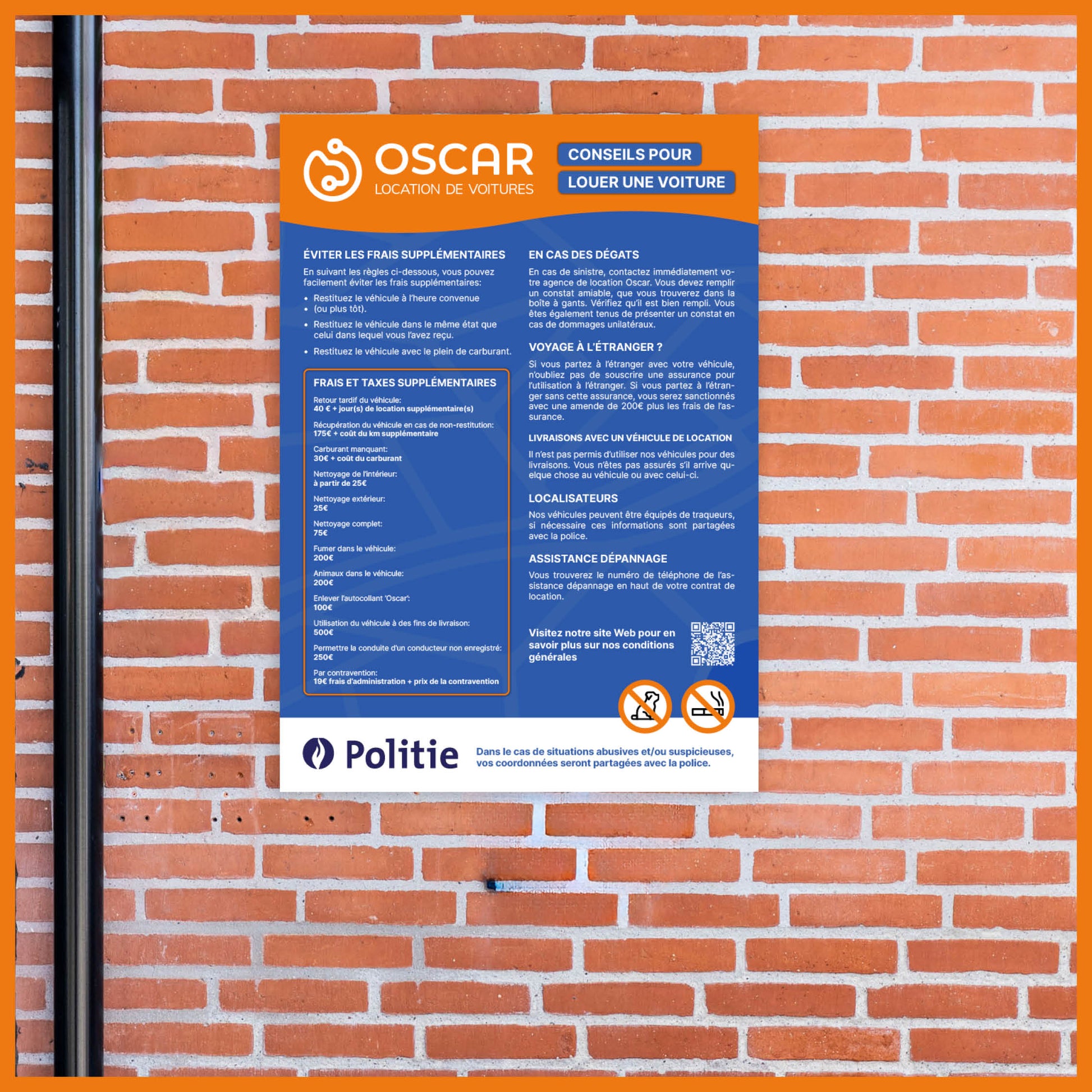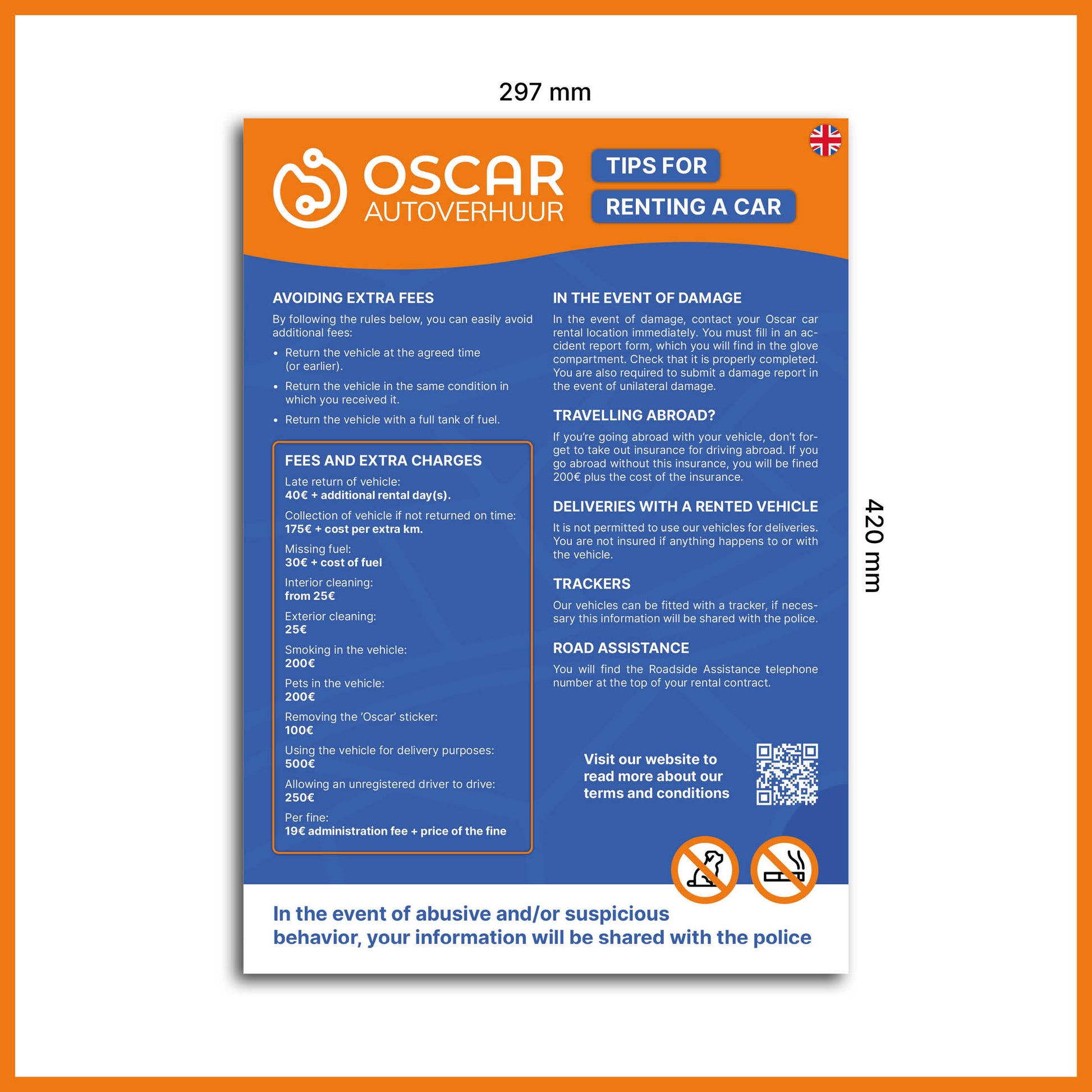 A helpful sign with tips and reminders to avoid extra charges when renting a car. Perfect for displaying at the counter or in the waiting area. Clear, informative, and customer-friendly.