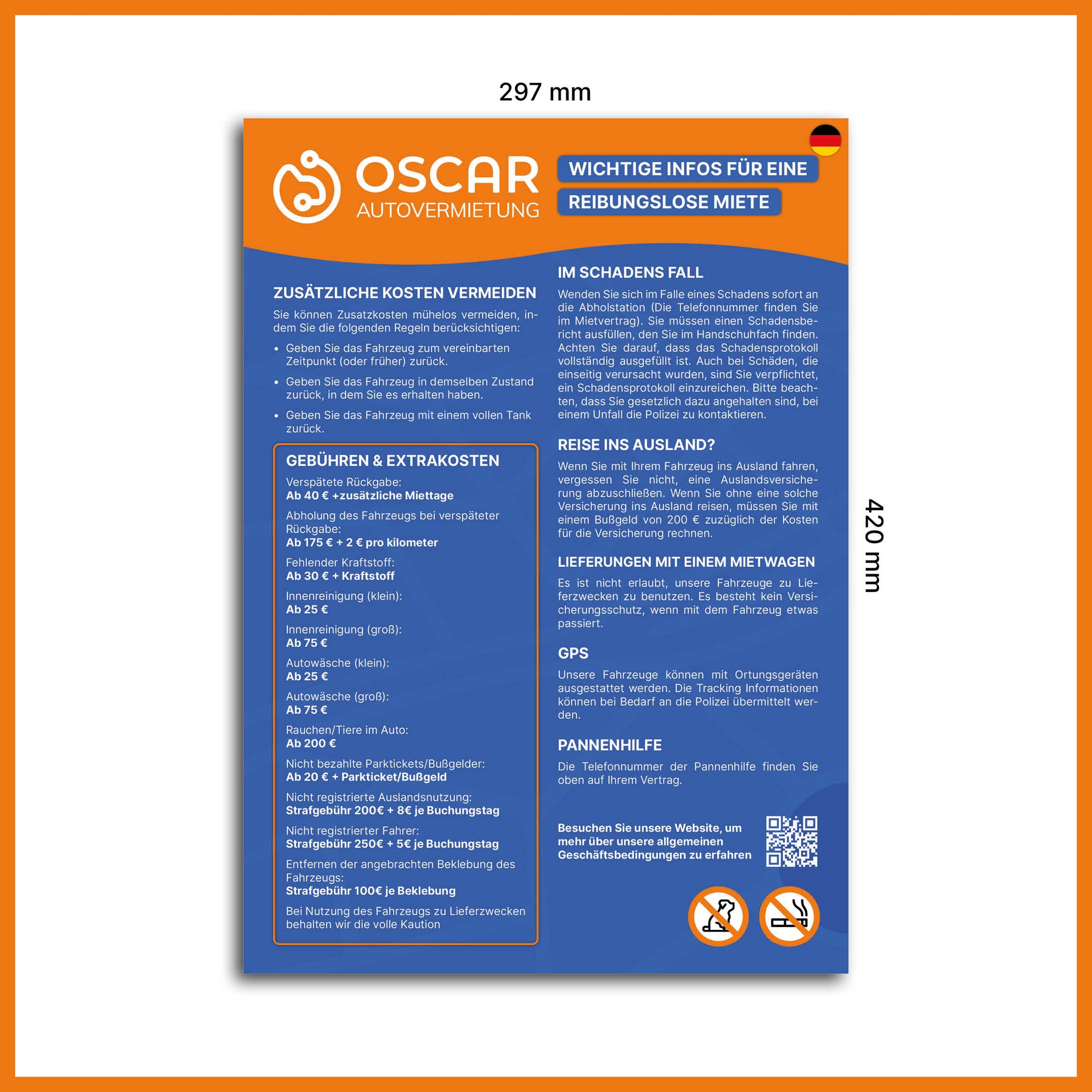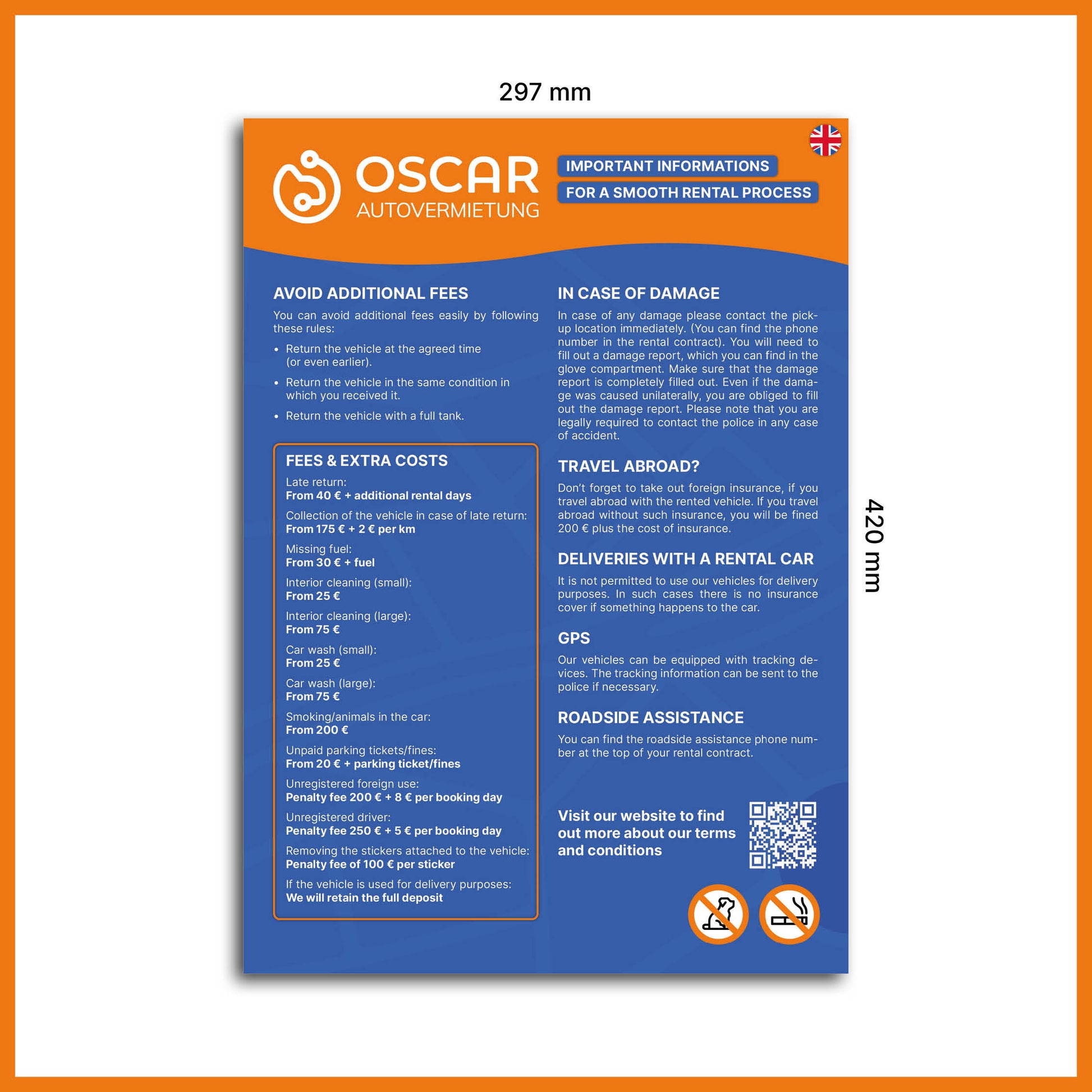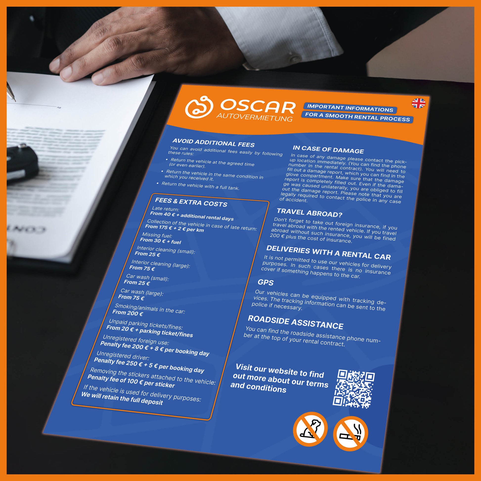 A helpful sign with tips and reminders to avoid extra charges when renting a car. Perfect for displaying at the counter or in the waiting area. Clear, informative, and customer-friendly.
