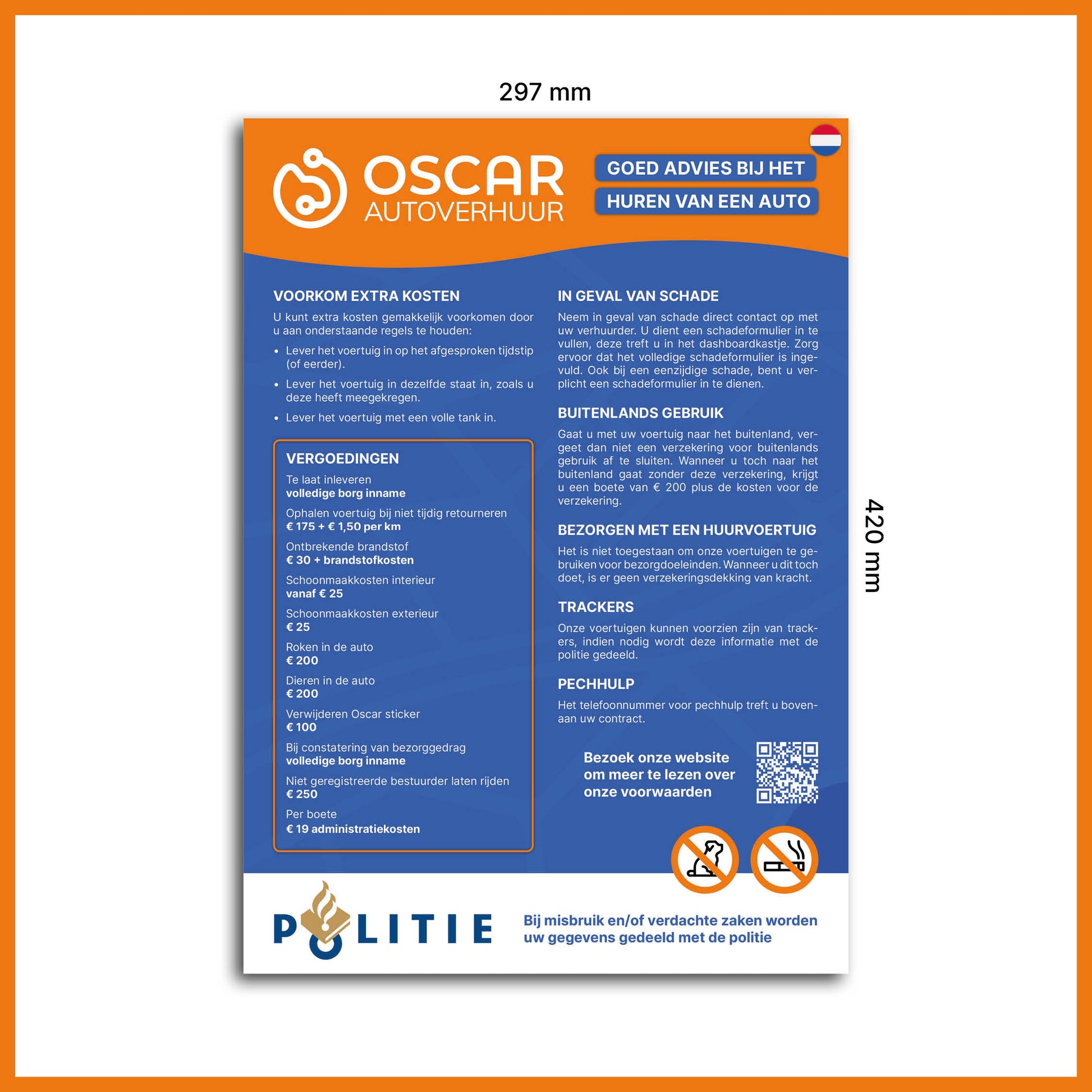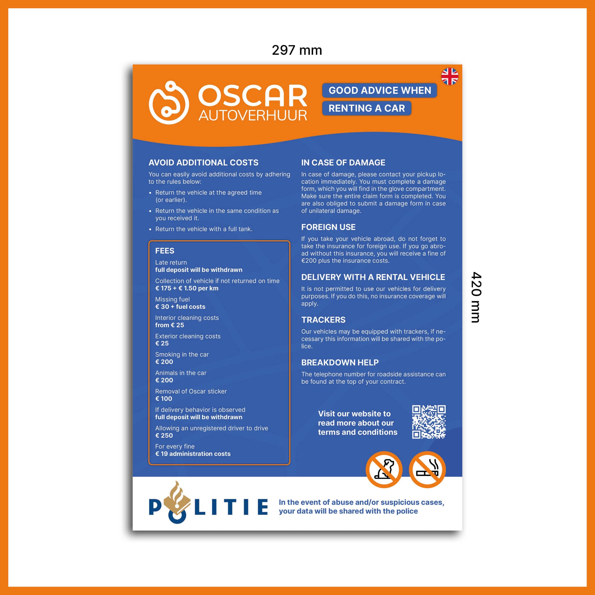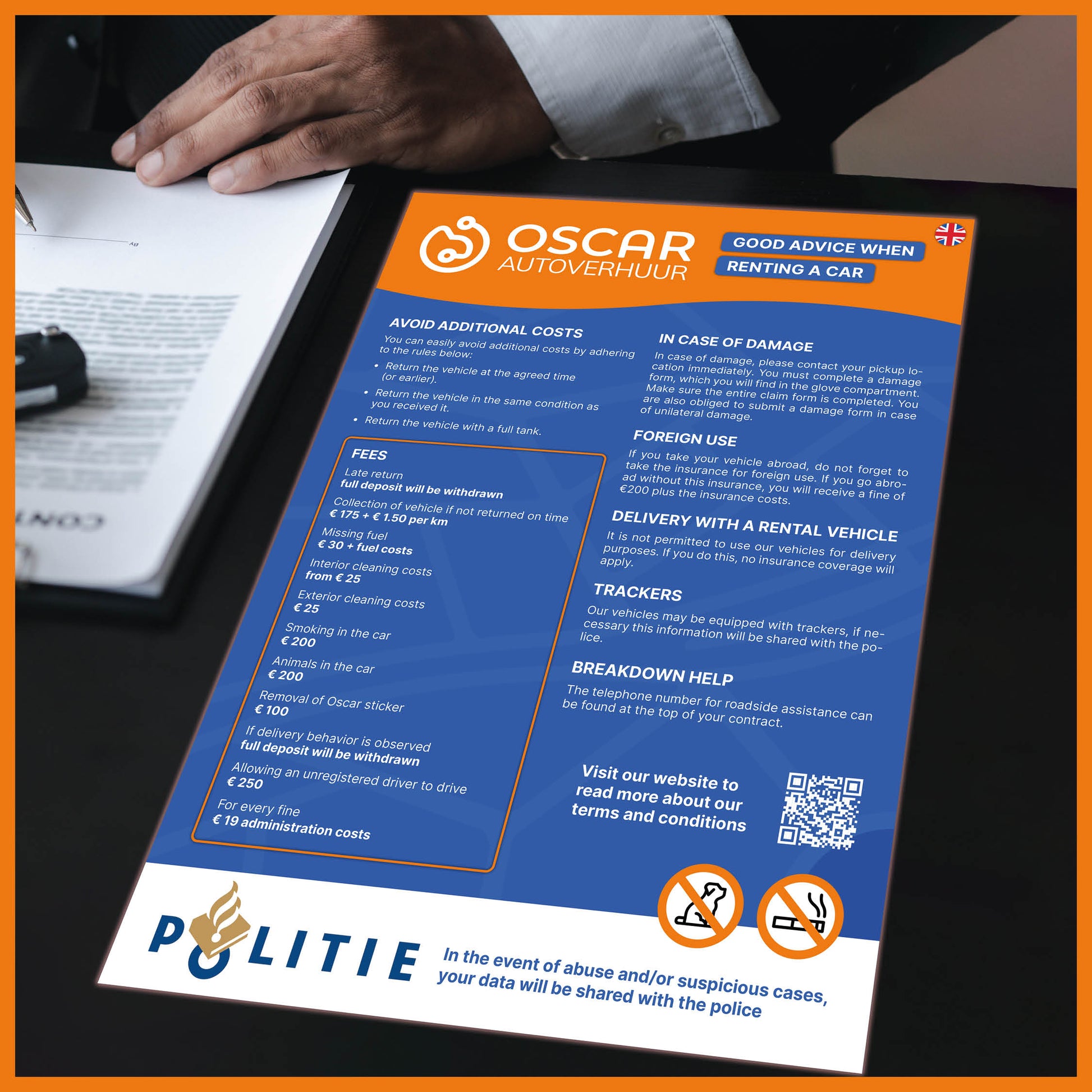 Een handig bord met tips en reminders om extra kosten te vermijden bij het huren van een auto. Ideaal om bij de balie of in de wachtruimte te plaatsen. Duidelijk, informatief en klantvriendelijk.